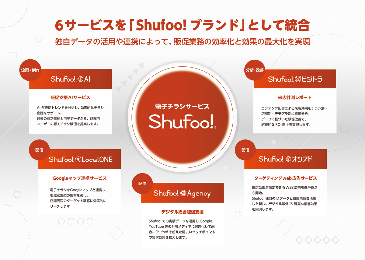 今回のブランド統合は、従来個別に展開してきた「Shufoo!AI」「LocalONE」「リテールマーケティングサービス」「ビジットトラッキング」などを含め、関連サービスの連携と相乗効果を明確にし、小売業界への効果的な販促ソリューションの提案を強化する狙いがある。Shufoo!ブランドとしてカラーも統一し、各サービス間の連携をわかりやすく伝えることで、顧客体験の向上を図る。
