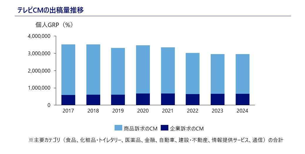 各社の企業ブランディングへの注力度合いは、テレビCMの出稿量にも表れている。図1は、テレビCMの出稿量推移を年別に示したものである。テレビCM全体の出稿量は年々減少傾向にある中で、企業訴求のCMの出稿量は維持されている。長期的なブランド価値や企業姿勢を消費者に浸透させることが、安定的な企業経営には重要であると認識されていることがうかがえる。