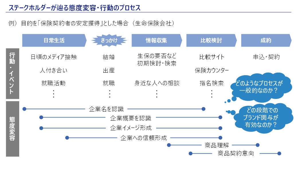 KPIの設定において重要なのは、ステークホルダーが最終的な行動に至るまでのプロセスを分解し、計測すべき「断面」を見極めることである。これは、ステークホルダーが情報を得て、態度を変え、行動に移すまでの間で、自社のブランディング活動がどの段階において最も影響を与えうるのかを特定することを指している。ステークホルダーの行動パターンが複雑化する現代において、この「断面」を正しく捉え、定量的に把握することが、KPIを適切に定めるための第一歩となる。