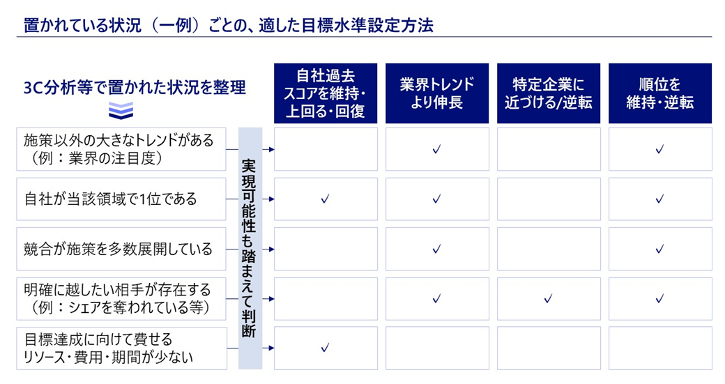 水準の決め方は、(1)自社の過去スコアを維持・上回る、(2)業界トレンドより伸長させる(3)特定の競合に近づけるか逆転する(4)順位を維持または逆転する の4つが存在する。自社が置かれた状況ごとに、目標水準を設定するために適した方法は異なるため、3C分析などによって自社が置かれた環境を正確に把握し、実現可能性を考慮して最適な目標を設定することが重要だ。