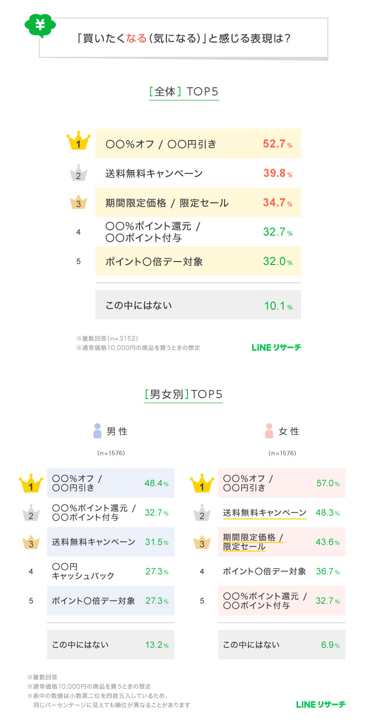特に女性で「期間限定価格/限定セール」「送料無料キャンペーン」の効果が高い傾向にあり、すべての年代で「〇〇%オフ/〇〇円引き」が1位となった。30〜40代では「〇〇%ポイント還元/〇〇ポイント付与」を重視する割合も高かった。