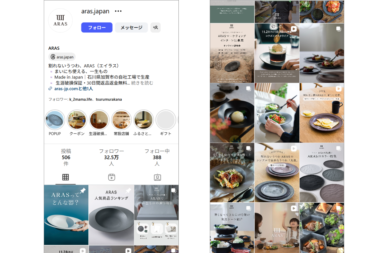 石川:地元・石川県ではテレビCMなども展開していますが、ブランドの立ち上げ当初からマーケティングの中核は一貫してInstagramです。今ではフォロワー数が32万人を超え、日本の食器ブランドというカテゴリーでは最大級のアカウントに成長しました。