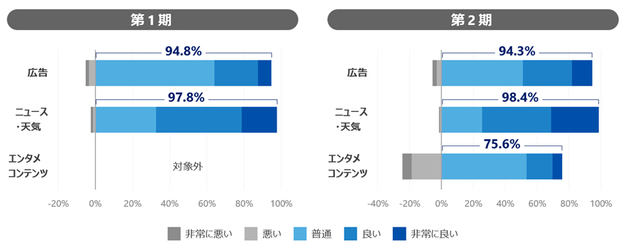 アンケートでは、広告やニュース・天気情報に対する印象について「普通」「良い」「非常に良い」といったポジティブな回答が90%以上を占めた。広告数が増えてもネガティブな反応増加は見られなかった一方、ゲーム性を取り入れたエンタメコンテンツへの受け入れには課題が残った。