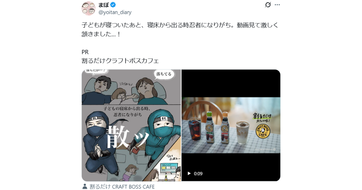 三浦:一つは、投稿文での投げかけをすることです。それに加えて、今回はインフルエンサーも起用し、話題化の火付け役になっていただきました。「夜、忍者のように抜け出す」というエピソードに共感してもらえる実際ママである漫画家さんに、「うちもこうしています」と関連した漫画を書いてもらい、動画とセットで投稿してもらいました。