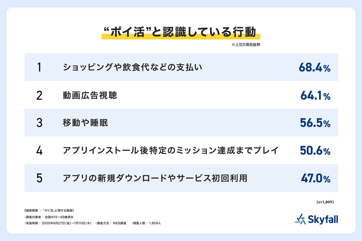 2025年10月21日、Skyfallは「ポイ活」に関する最新調査結果を公表した。本調査は、全国の15歳から69歳の男女1,809人と、そのうち1ヵ月以内に共通ポイントを貯めるポイ活を実施した946人を対象に、2025年6月27日から7月10日にかけて実施された。