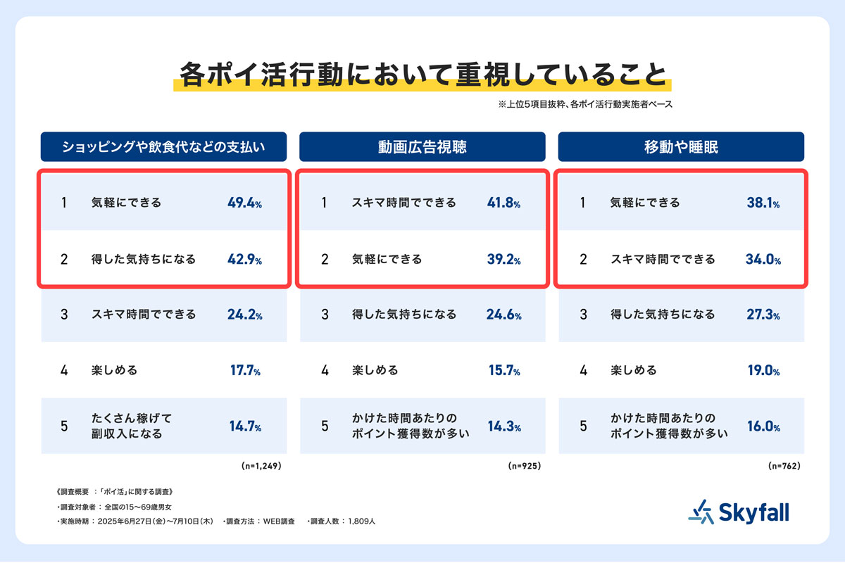 また、各ポイ活行動で重視されているポイントとして「気軽にできる」が挙げられている。動画視聴や移動・睡眠では「スキマ時間でできる」ことも重視されており、生活の中で無理なくポイントを獲得できる機会を中心にポイ活が広がっていることが分かった。