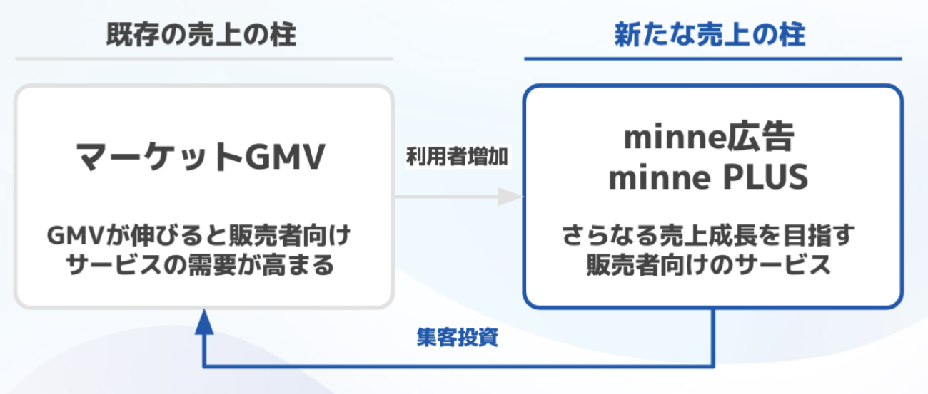 minne byGMOペパボ側が「minne広告」「minne PLUS」で得た収益は、マーケットのGMV(流通取引総額)向上や集客への投資に還元する「還流モデル」を構築しており、新たな収益柱で得た売上を既存事業の成長投資に活用し、全体の拡大を図っている。