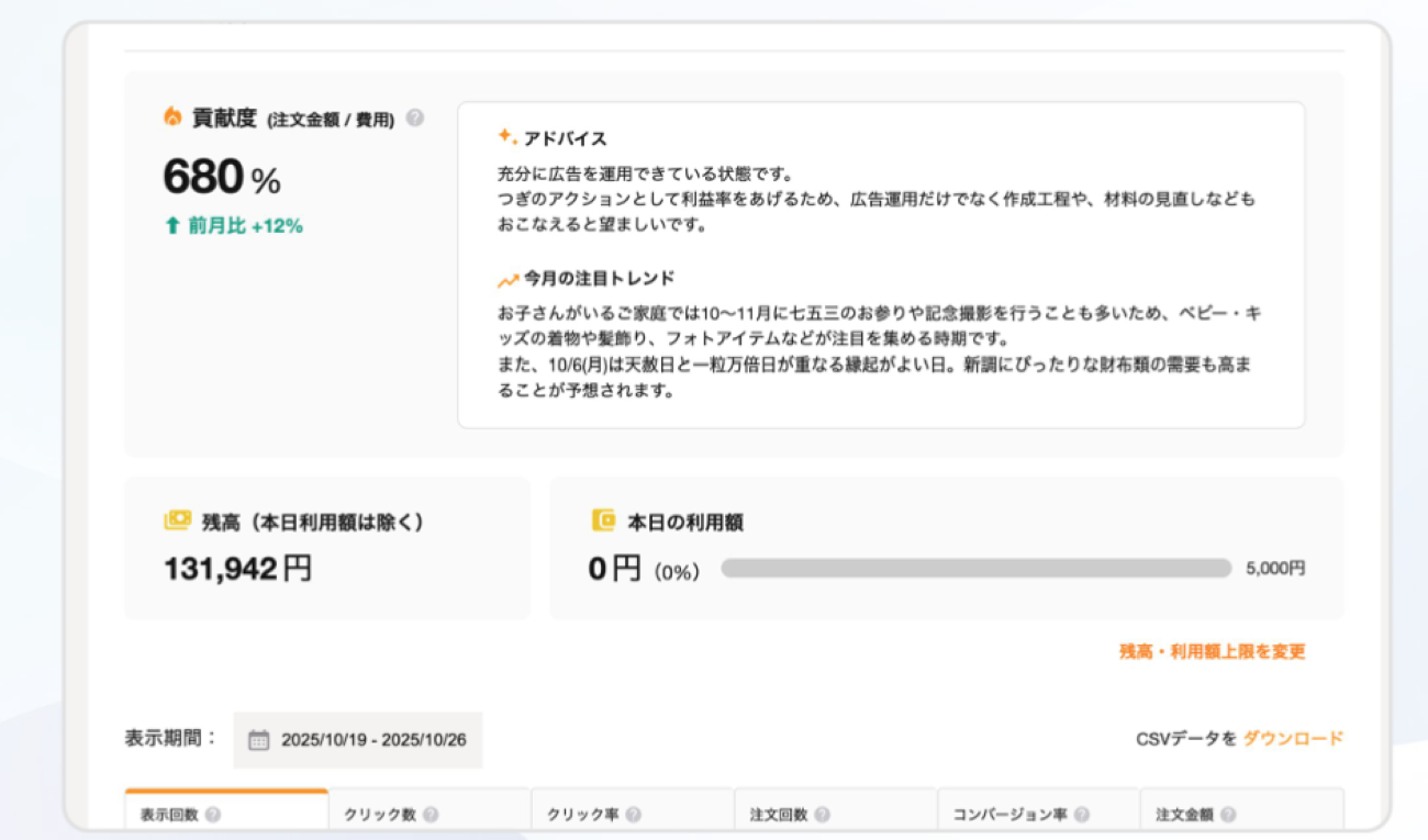 管理画面では「貢献度(注文金額÷費用)680%」のような視覚的な指標を表示し、成果を実感しやすくしている。加えて、状況に応じた運用アドバイスや今月の注目トレンド情報を提供する。
