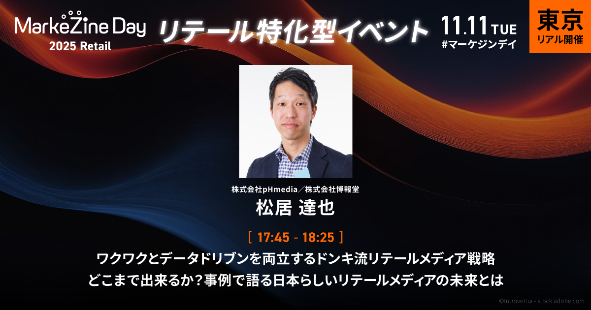 17:45~18:25にA会場で実施するセッション『ワクワクとデータドリブンを両立するドンキ流リテールメディア戦略 どこまで出来るか?事例で語る日本らしいリテールメディアの未来とは』はpHmedia COO 兼 経営戦略室 責任者を務める松居氏が登壇。データドリブンに「ワクワク・ドキドキ」を提供するドン・キホーテが、リテールメディア事業会社のpHmediaを通じて実践する、「四方よし」のリテールメディア戦略を紹介します。