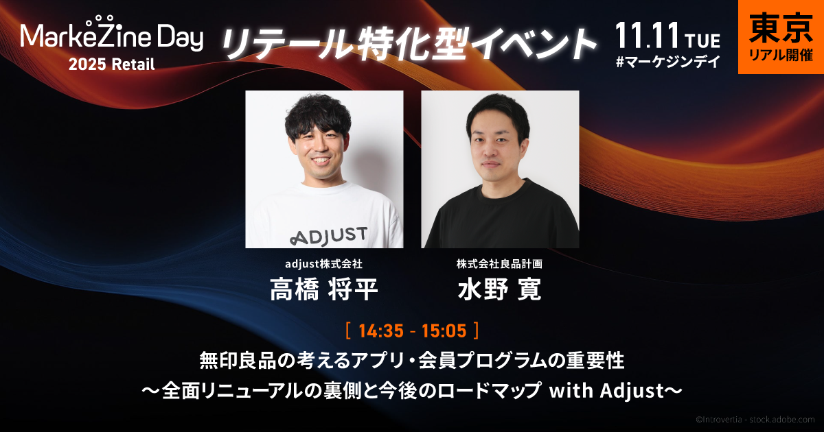 14:35~15:05にB会場で実施するのは『無印良品の考えるアプリ・会員プログラムの重要性~全面リニューアルの裏側と今後のロードマップwith Adjust~』と題したセッション。2025年9月に実施された、無印良品の公式アプリのリニューアル事例が紹介されます。