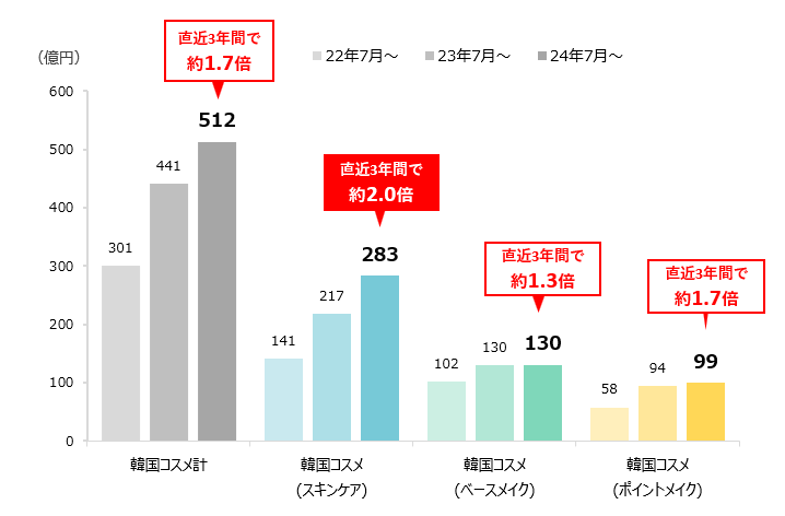 インテージSLIのデータをもとに市場規模の推移を見ると、韓国コスメ市場は直近3年で約1.7倍に成長しており、今なお拡大を続けています。中でも、スキンケアカテゴリーが直近3年間で約2倍と大きく拡大しており、韓国コスメ市場の成長をけん引しています。