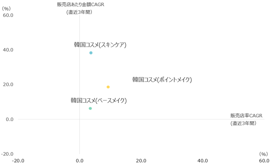 これらの韓国コスメの市場拡大の背景として、店頭での展開がひとつの要因として挙げられます。下記は、ドラッグストア全店における韓国コスメの販売店の割合(販売店率)、および販売店1店あたりの韓国コスメの平均販売金額(販売店あたり金額)について、直近3年間での年平均成長率(CAGR)を散布図で示したものです。