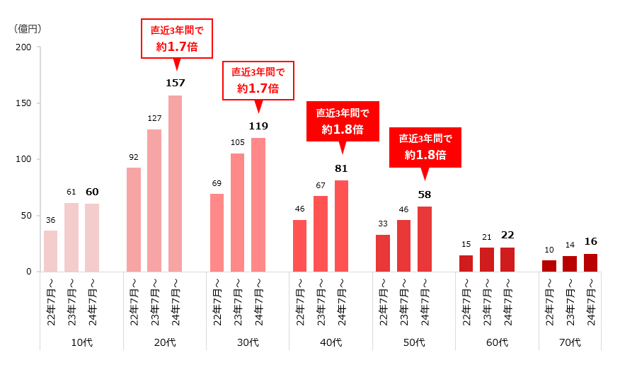 韓国コスメ購入者のボリュームゾーンは依然として20代が中心ですが、特に注目すべきは40~50代での伸長です。直近3年間で各年代ともに拡大傾向にありますが、特に40~50代で増加率が高く、勢いが感じられます。
