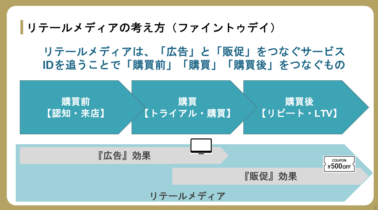 益川:リテールメディアの特長の一つに、「広告」と「販促」を繋げられるという点があります。購買前や購買の瞬間に想起率を高める広告としての機能もありながら、店頭で購買を後押しする販促の機能もあり、さらにリピート購入を促すCRMのような施策もできます。従来は「購買前」「購買」「購買後」で分断されていましたが、リテールメディアはそれらを繋げることができるわけです。よって、重要な顧客接点であると考えています。