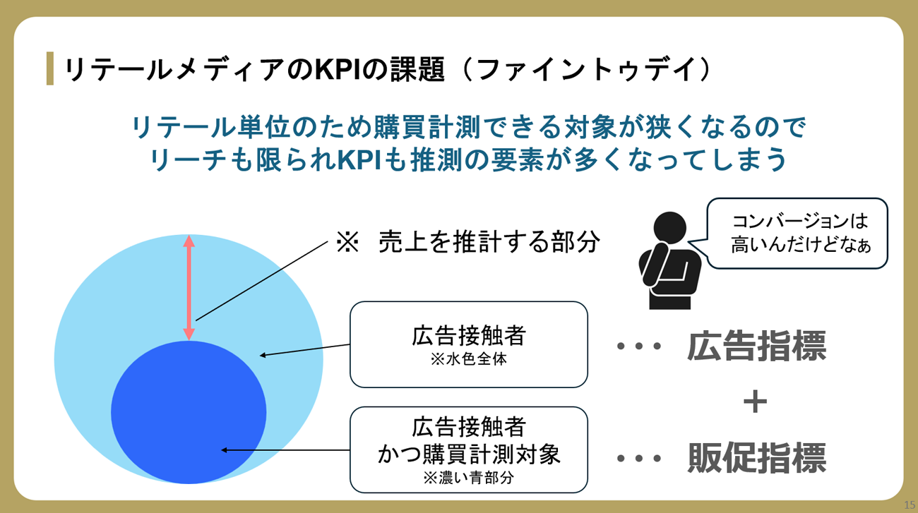 ただ、リテールメディアも万能ではなく、「一貫して評価できない」という課題があると考えています。たとえば、「購買前」の広告効果にフォーカスすると、どうしても通常のデジタル広告やテレビに比べてリーチが少ないと評価されてしまいます。また「購買の瞬間」については、広告効果と販促効果の両方が期待できるので、どちらの指標で評価するか、広告費と販促費どちらの予算をあてるのかといった問題が出てきます。