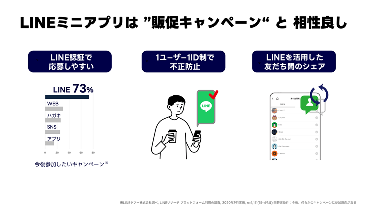 江田氏は「LINEミニアプリは販促キャンペーンと相性が良いのです。LINE認証のみで応募できることに加え、原則1ユーザーにつき1IDなので、不正も防止できます」と説明する。また、LINEの友だちにキャンペーン情報をシェアしてもらいやすいこともメリットだという。