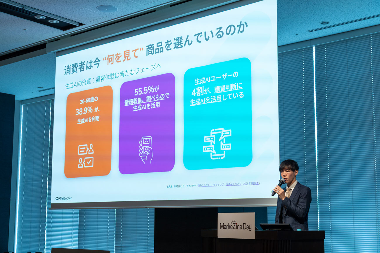 「特にAIの存在は無視できない。データによると、半数以上の人が情報収集やリサーチを目的に生成AIを活用している」と髙橋氏は説明。さらに注目すべき点は、生成AIユーザーの約4割が購買判断の際にAIを活用していることである。つまり、「情報収集から購買決定に至る一連の流れがAIを介して行われる時代へと進みつつある」のだ。