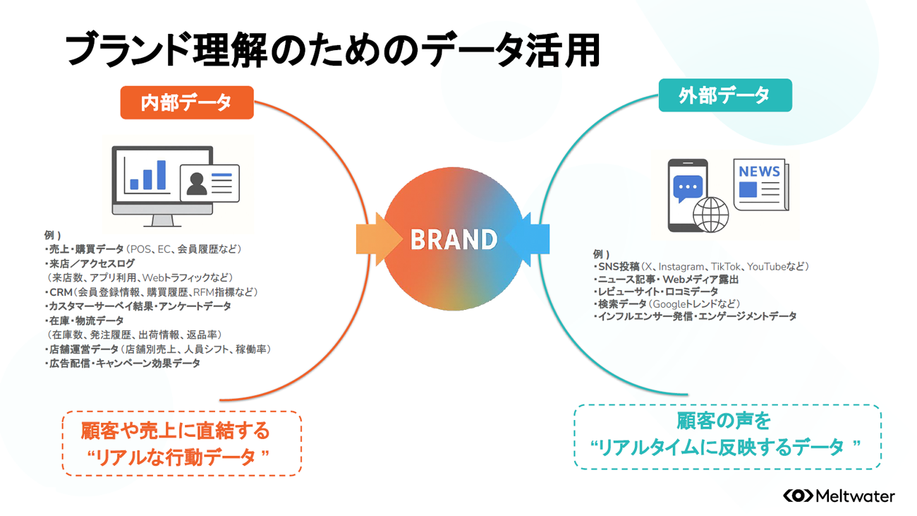 一方で、近年のデータ量増加と影響力の増加とともにニーズが高まっているのが、外部データ(SNS投稿やニュース記事、レビューサイトなど)であり、顧客の声を“リアルタイムに反映するデータ”とされている。