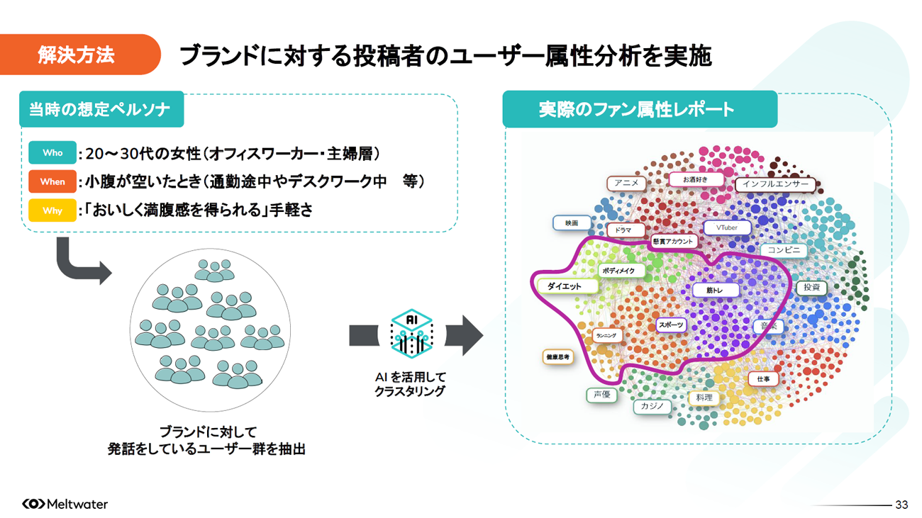 現状を把握する目的で、ユーザーの属性分析調査を実施。従来の肌感覚に頼った推測ではなく、AIを活用したソーシャルリスニングによってユーザー群を抽出し、クラスタリング分析を行った。その結果、健康志向、筋トレ、ボディメイクといった運動後の摂取を目的とした層が相当数存在することが判明した。ブランドが気づいていなかった、ユーザーにとっての商品価値が明らかになったのだ。