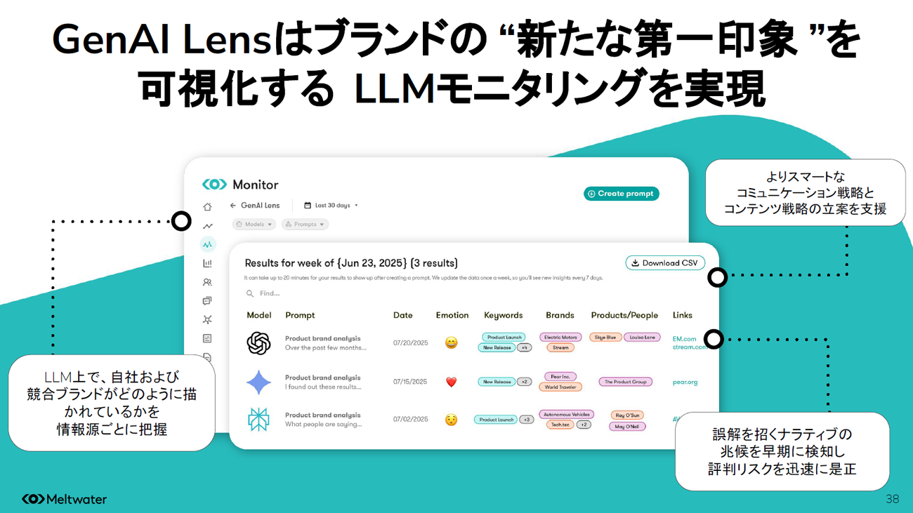 そこで注目したいのが、Meltwaterが展開する「GenAI Lens」である。GenAI Lensは、ChatGPT、Gemini、Perplexity、Claude、Grok、DeepSeekなどの主要なAIアシスタント/LLMにおいて、自社のブランドや製品、競合がどのように言及されているかを収集・分析する。LLMの回答内容を取得し、それがどこから情報を取得しているかも可視化できる。