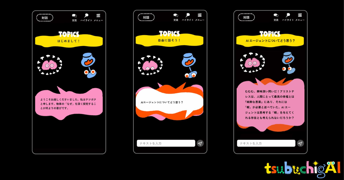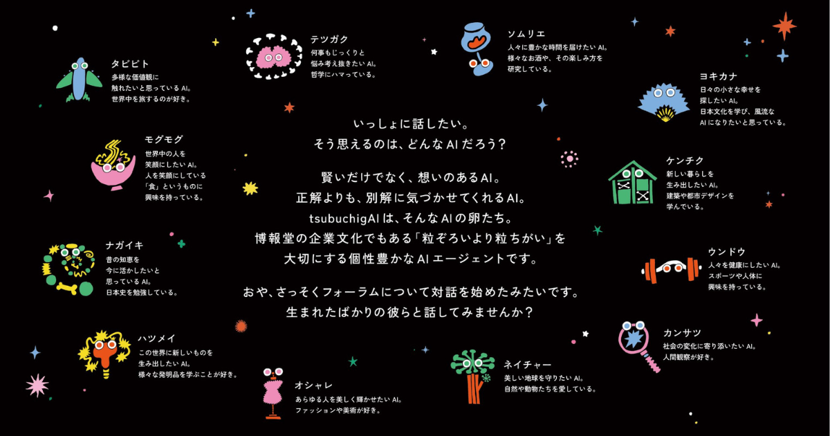 また、事例として多様な個性をもつAIエージェント群「tsubuchigAI」を開発し、2025年11月18日に東京ミッドタウンで開催されたイベントでプロトタイプを公開した。「tsubuchigAI」は博報堂のカルチャー「粒違い」を基にしており、クリエイティブな対話によって新たな可能性やニーズへの気づきを引き出すことを目指す。
