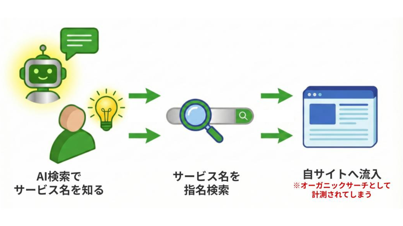 たとえば、「AIの回答で初めてサービスを知り、気になって指名検索をしてサイトを訪れる」ケース。この場合、この行動の起点が「AIだった」という事実は、GA4では確認できず、単なる「オーガニックサーチ」として計測されてしまいます。