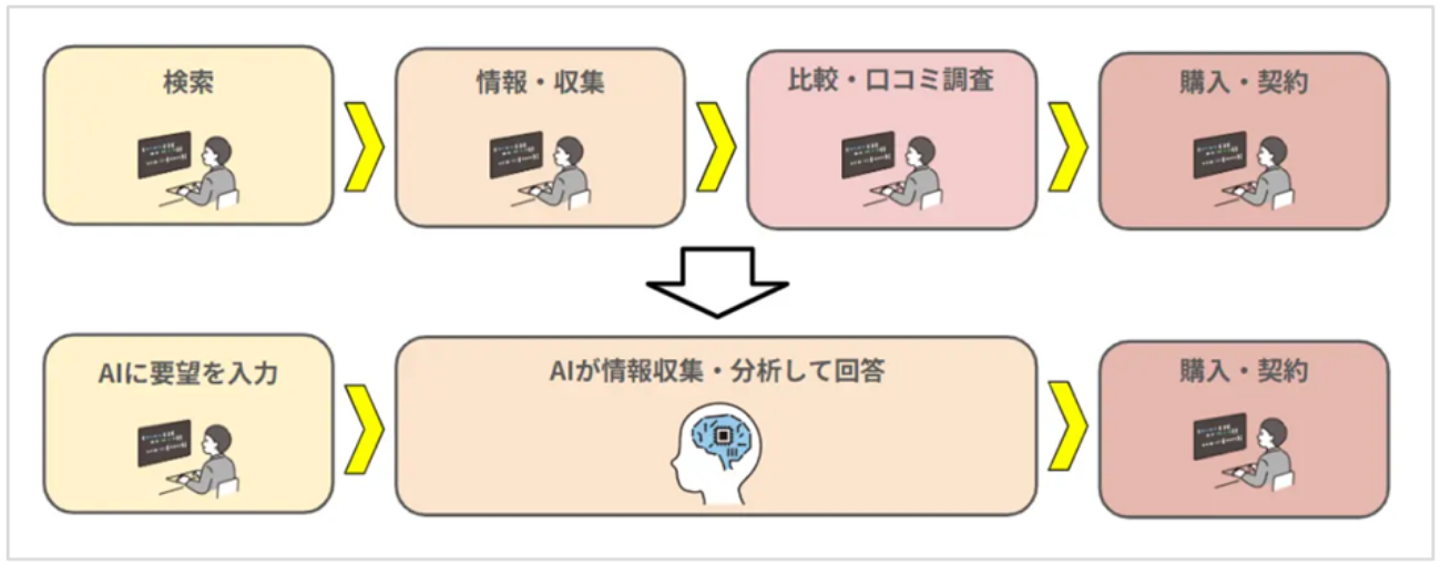 しかし現在は、まずユーザーがAIに要望を伝え、AIが代わりに情報収集や比較検討を行い、その結果をユーザーに提案。ユーザーはその提案をもとに意思決定する流れへと変化しています。