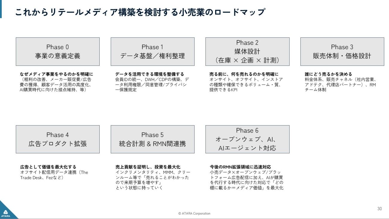 続いて杉原氏は、これからリテールメディアに取り組む、あるいは再構築を検討する小売企業に対し、Phase0からPhase6までのロードマップを提示した。