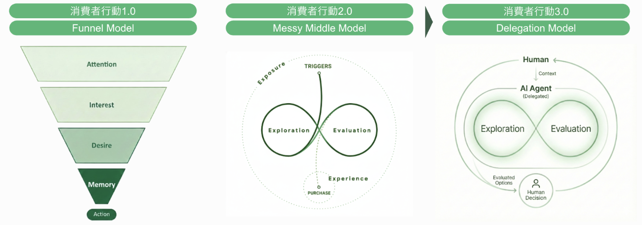 左から従来の「ファネルモデル」、Googleが提唱した「メッシーミドルモデル」、そして「Delegation Model 」。Delegation Model ではAIがゲートキーパーとなり、人間に代わって情報の選別を行う