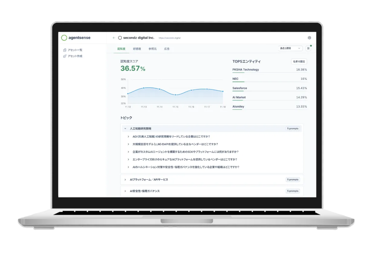 板井:その通りです。そこで、自社がAI検索上でどう扱われているかを把握する手段として活用できるのが、当社が提供するAI検索最適化のためのAIエージェント「secondz Agentsense」です。