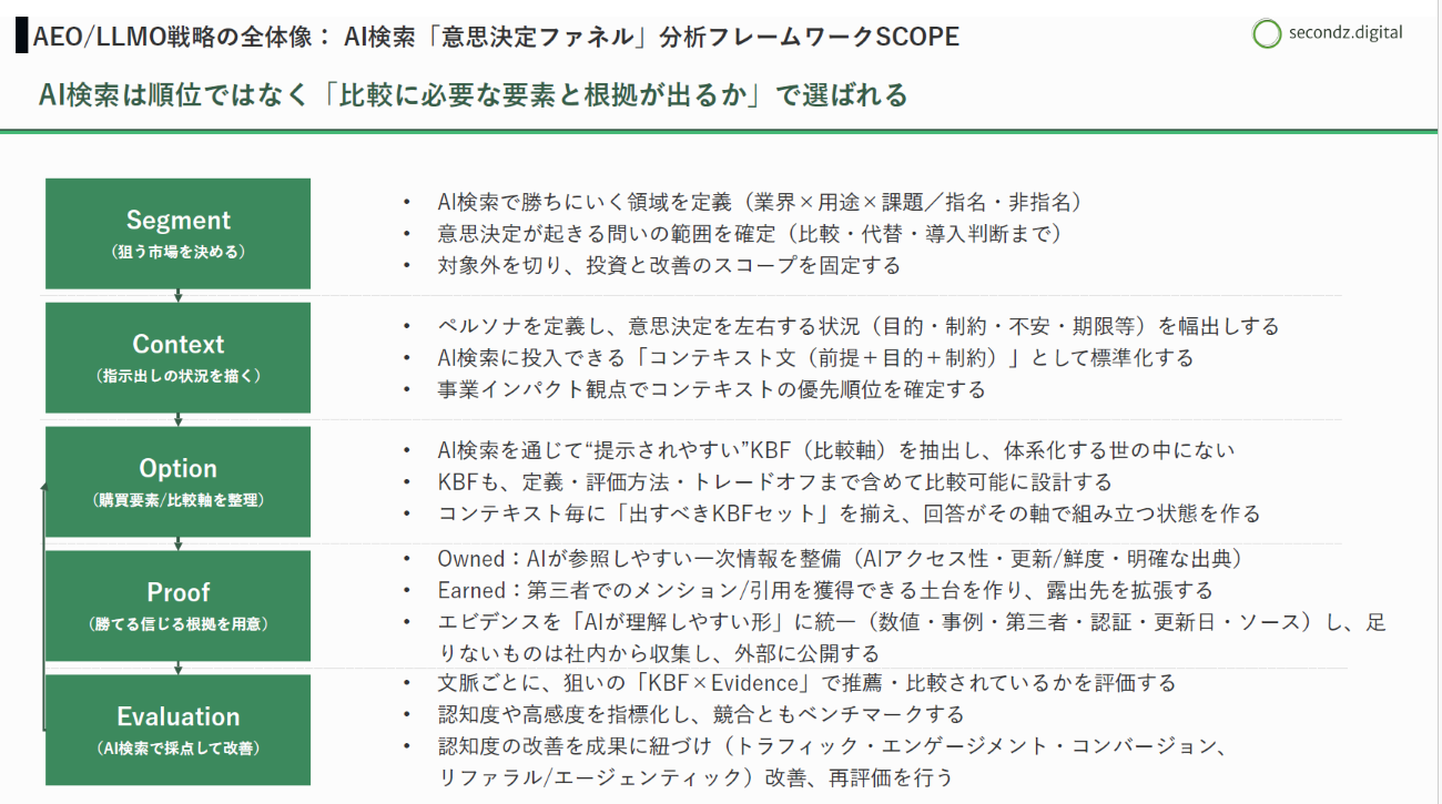 板井:当社では、AI検索時代における意思決定ファネルを分析するための「SCOPE(スコープ)」というフレームワークを独自開発しました。