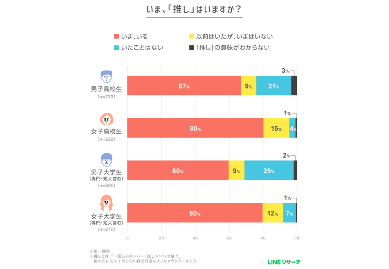 まず、推しの有無を尋ねると、「今推しがいる」と回答した女子学生(高校生・大学生)は約8割で、男子学生を上回った。