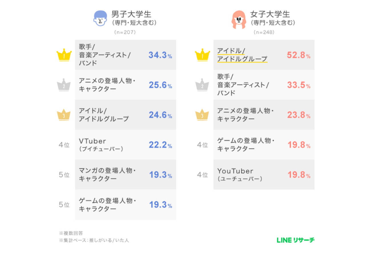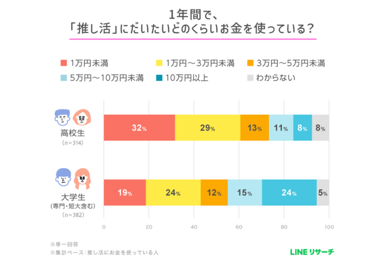 LINEリサーチは、全国の15~25歳の学生を対象に“推し活事情”に関する調査結果を発表した。「推し」の対象は人やキャラクターとなり、それ以外の「モノ(施設や概念)」は除く。以下、一部内容を紹介する。