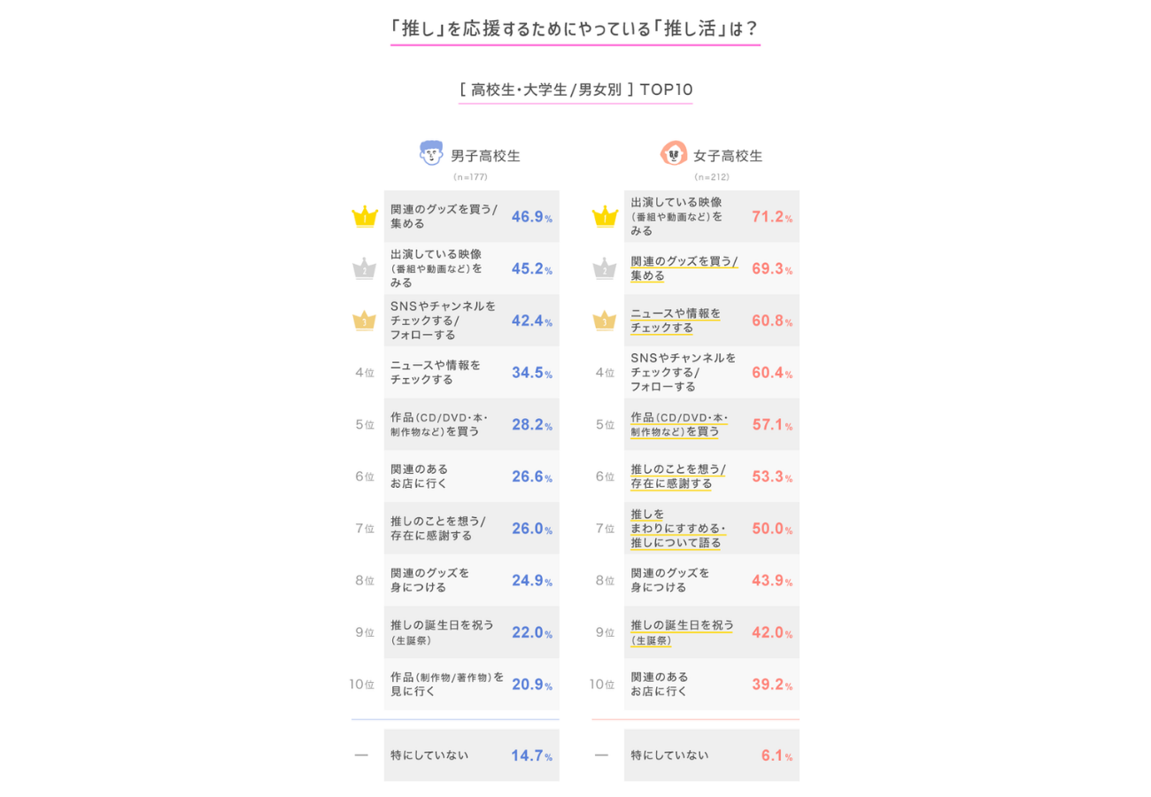 男子高校生は「関連のグッズを買う/集める(46.9%)」「出演している映像(番組や動画など)をみる(45.2%)」などが中心だった一方、女子高校生では「出演している映像(番組や動画など)をみる(71.2%)」「ニュースや情報をチェックする(60.8%)」「作品(CD/DVD・本・制作物など)を買う(57.1%)」「推しのことを想う/存在に感謝する(53.3%)」が男子高校生よりも30ポイント前後高くなった。この他女子高校生は、「推しをまわりにすすめる・推しについて語る」や「推しの誕生日を祝う」なども挙がった。