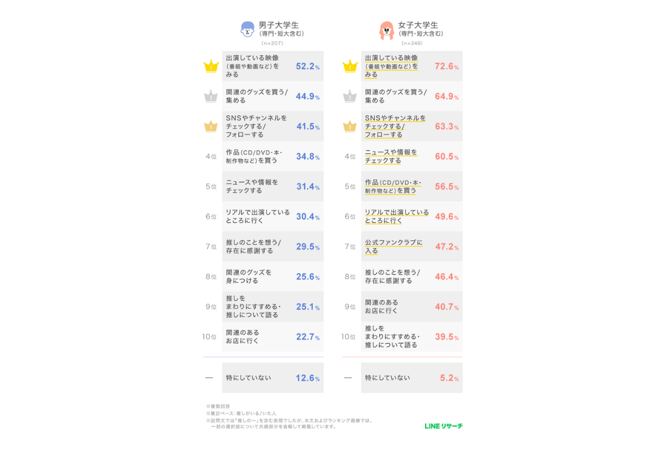 大学生では「リアルで出演しているところに行く(男子:30.4%、女子:49.6%)」や女子大学生の「公式ファンクラブに入る(47.2%)」も上位に入った。