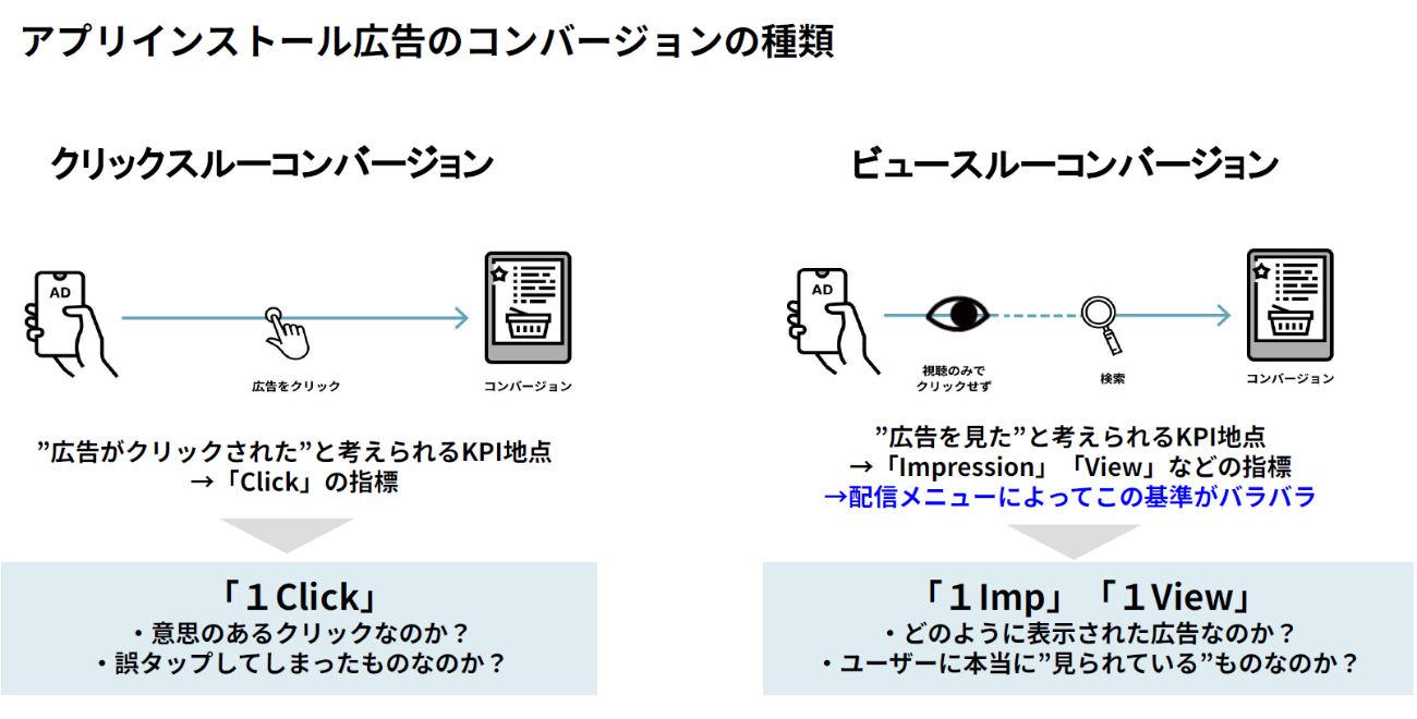 まずアプリ広告では、正確な効果計測が非常に難しいことが課題となっている。計測の指標にはラストタッチアトリビューションが使われることが多い。だが、直接CV(クリックスルーCV)ではこの評価の起点となるクリックがユーザーの意思によるものか、誤クリックによるものか判断ができない。間接CV(ビュースルーCV)においても、どう表示された広告か、ユーザーに適切に見られているのかなどが可視化できず、態度変容を測ることは困難となる。
