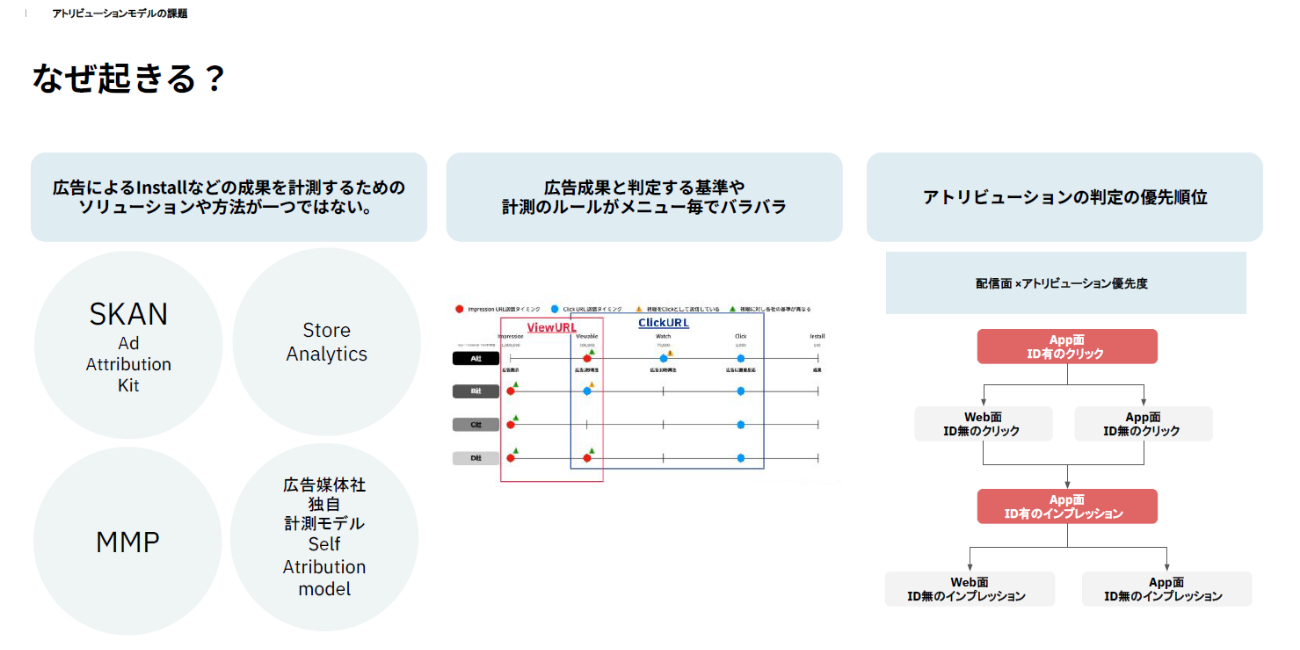 それらに加えて、効果を測定するソリューションやメニューによって計測指標の定義がバラバラだったり、アトリビューションの内容によって判定の優先順位が異なったりするなど、広告効果を同じ基準で計測・比較できない課題があるのだ。