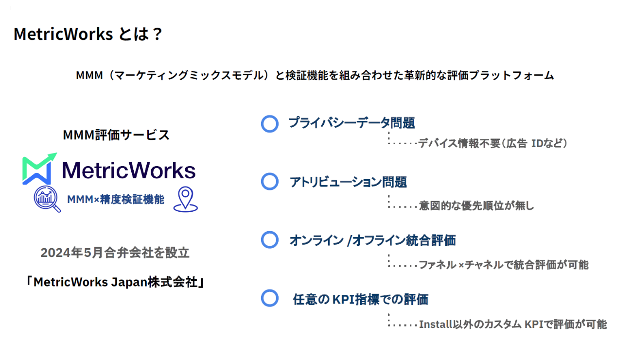 とはいえ、App Analyticsだけでは間接効果を定量化するのは難しい。そこで、MMMと検証機能を組み合わせた評価プラットフォーム「MetricWorksを活用。実際にどのようなことができるのか、MetricWorks Japanの神田氏が解説した。