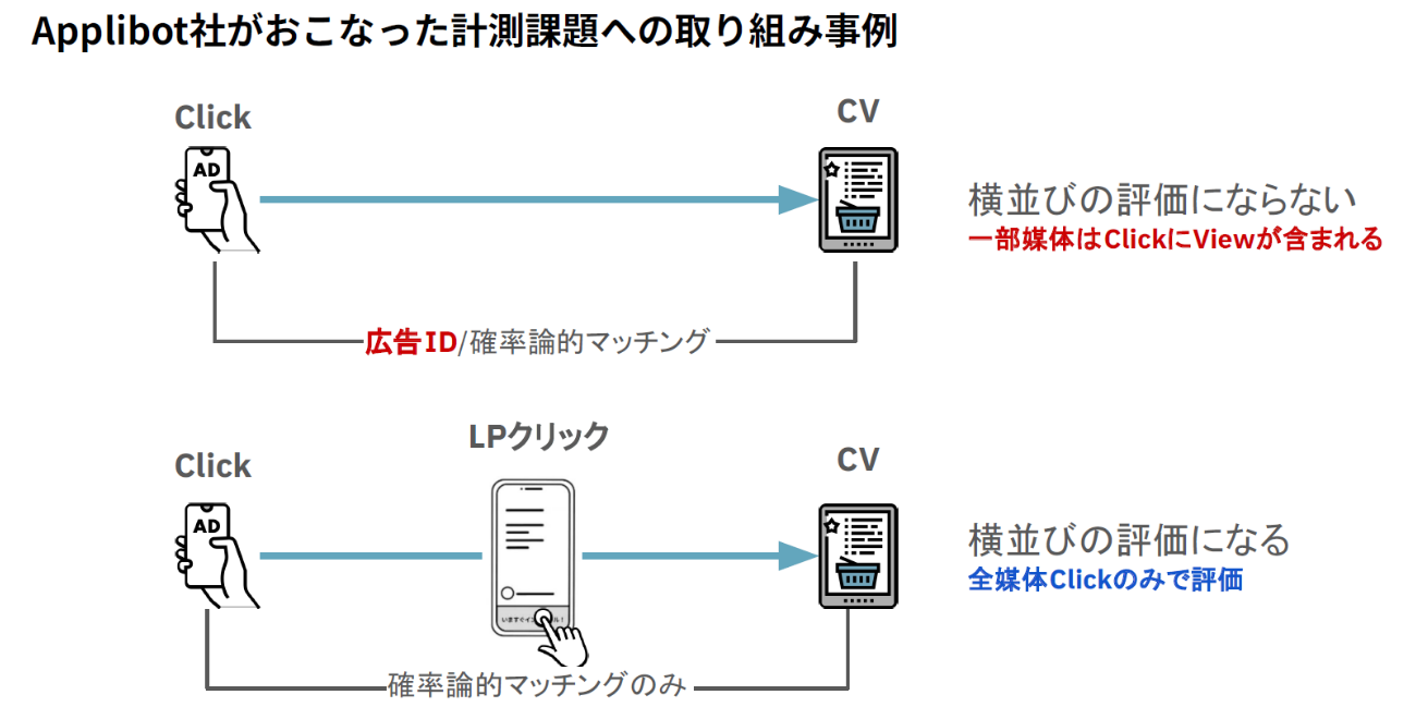 では、家門氏らは、どのようにしてアプリ広告の効果をより適切に計測しようとしたのか。セッションでは、サイバーエージェントの子会社であるApplibotで実施した取り組みが紹介された。まずは、アプリ広告の計測が問題であることから、LPを挟んで計測するフローに変更。これにより、どの媒体やネットワークも同じ評価基準で比較し、最適化することが可能となった。