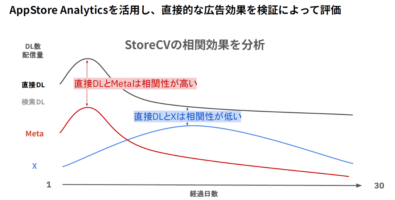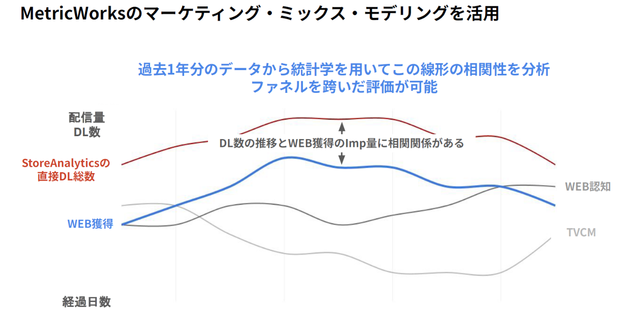 MetricWorksでは、統計学を用いたMMMでインクリメンタリティを計測。配信量やコスト、アプリのKPI、App Storeでのダウンロード数など、過去1年分のデータを入れるとグラフが示される。その中で相関性のあるものに評価を割り戻すというモデルになっており、間接効果も評価できる点が強みだ。