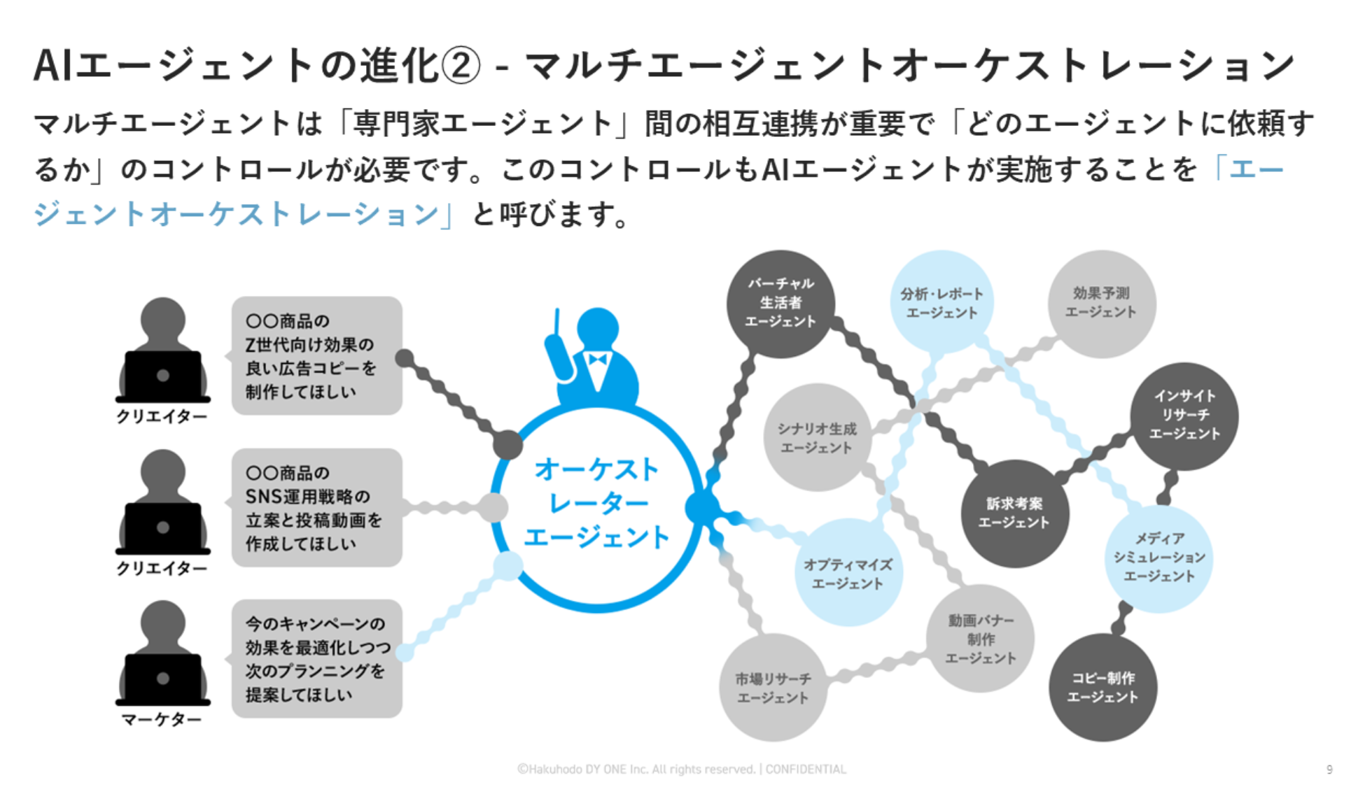 柴山:まだ試験運用中の段階ですが、AIエージェントは今後、複数の専門AIエージェントが相互連携するマルチエージェント(A2A:Agent to Agent)の世界観へと変化していくと考えています。このマルチエージェントをコントロールするために、私たちは「AIエージェントオーケストレーター」を開発しています。これはテクニカルに言えば、マーケティング専用のリーズニングモデル(推論モデル)に当たります。