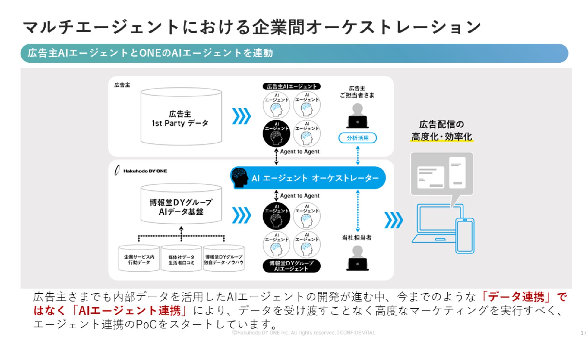 押久保:AIエージェント活用が今後進む中で、AIエージェント同士を連携させるオーケストレーションが重要になると言われています。「ONE-AIGENT」はさらに広告主のAIエージェント構築および連携も掲げられていますが、この次世代マーケティング戦略についても教えてください。