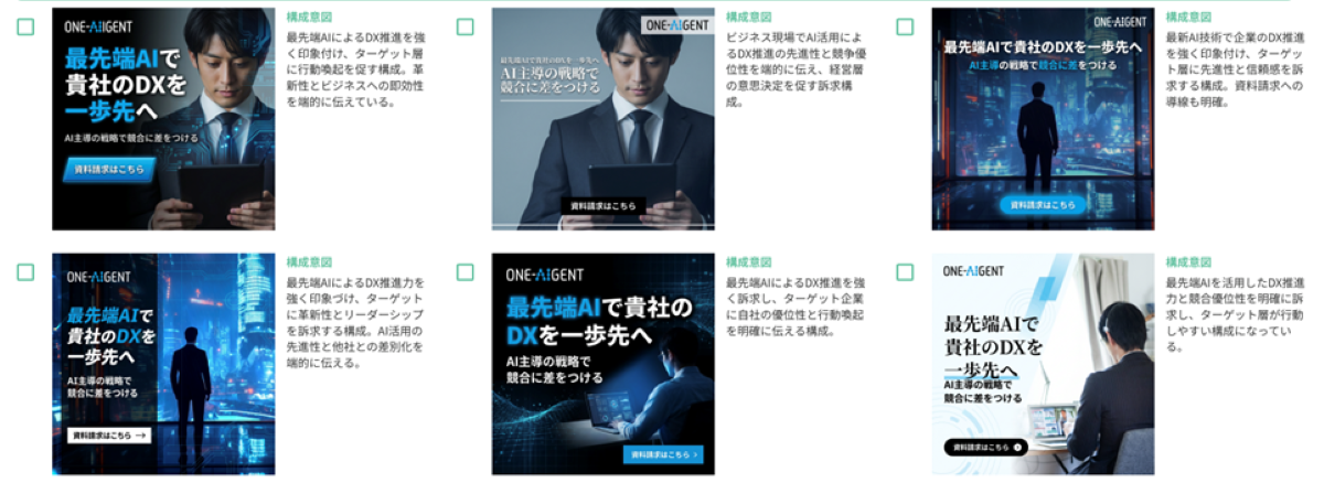 野口:前回見せていただいたアウトプットイメージは、鮮烈でした。このようにバナー広告を量産でき、「広げる」「深掘る」といった訴求の方向性も確認できると、配信後の知見も相当蓄積できそうです。訴求の方向性や、「このワードを入れたい」といった細かい部分まで、指定することもできるのですか?