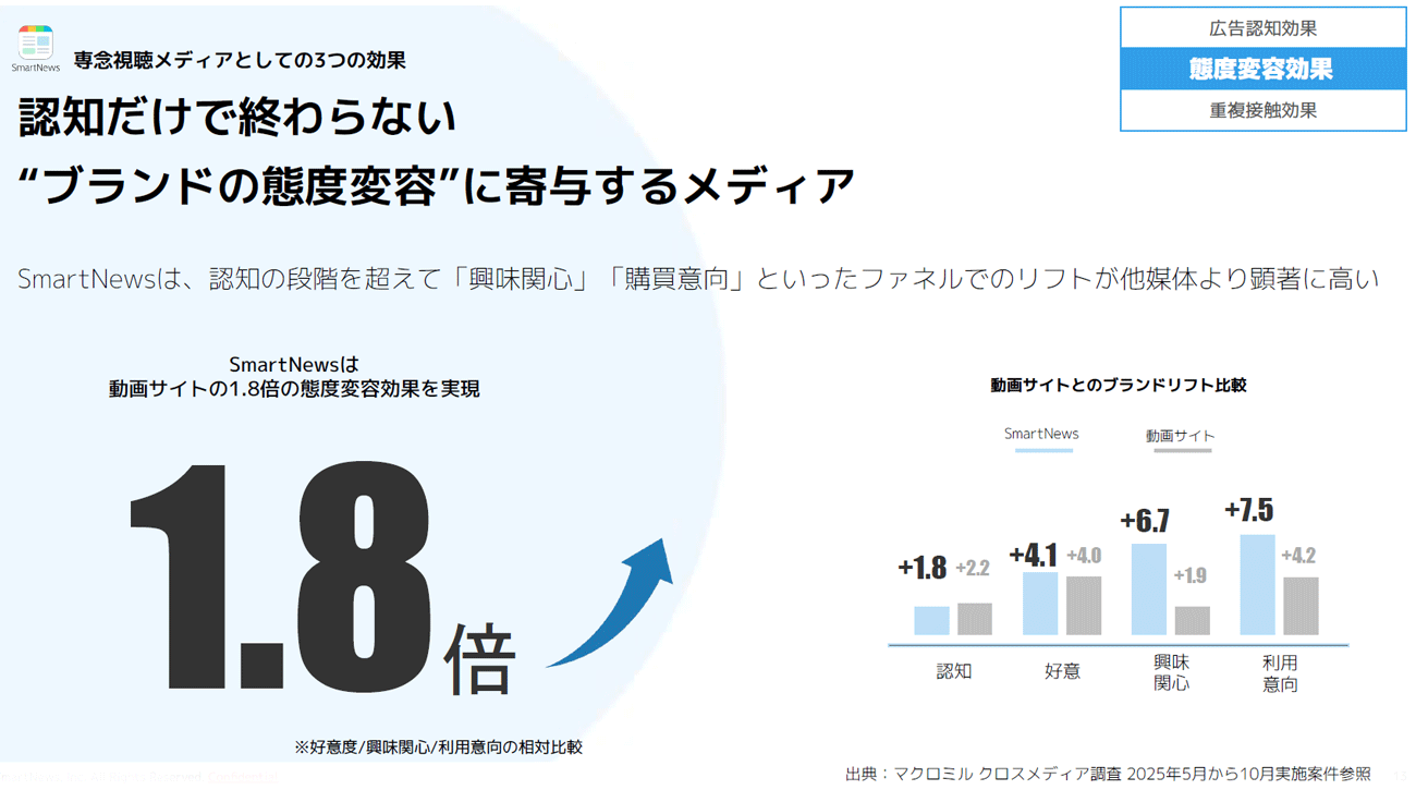 山田:はい。具体的には、SmartNewsの価値は「1. 広告認知」「2. 態度変容」「3. TVとの相乗効果」という3つのメリットに集約されます。