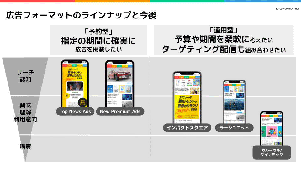3つ目は、「目的に応じた多様な広告商品の使い分け」です。SmartNews Adsでは、画面を大きく占有する予約型広告(インパクト)と、効率的に配信できる運用型広告(効率)の多様なフォーマットを用意しています。これらを併用することで、たとえば商品認知が16.7%から20.7%まで向上したデータもあり、組み合わせによる高いブランドリフト効果が期待できます。