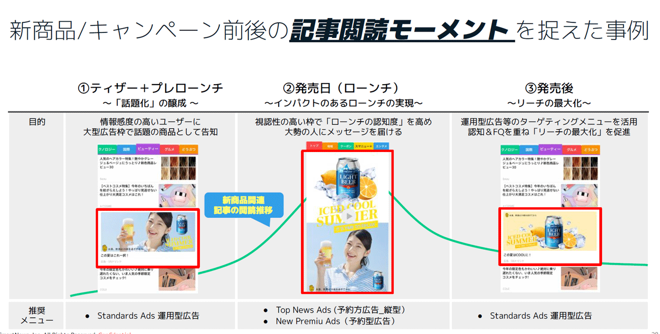 1つ目は、「ティザー~リリース~定着(サステイン)」の時系列でプランニングをして活用する方法です。特に新商品などのキャンペーンでは、フェーズに応じた使い分けが有効です。発売前の「ティザー期」や発売後の「定着時」には運用型広告を活用し、発売当日の「リリース時」にはトップ画面を占有するようなインパクトのある縦型広告(Top News Video Adsなど)で一気に認知を獲得する、といった設計です。