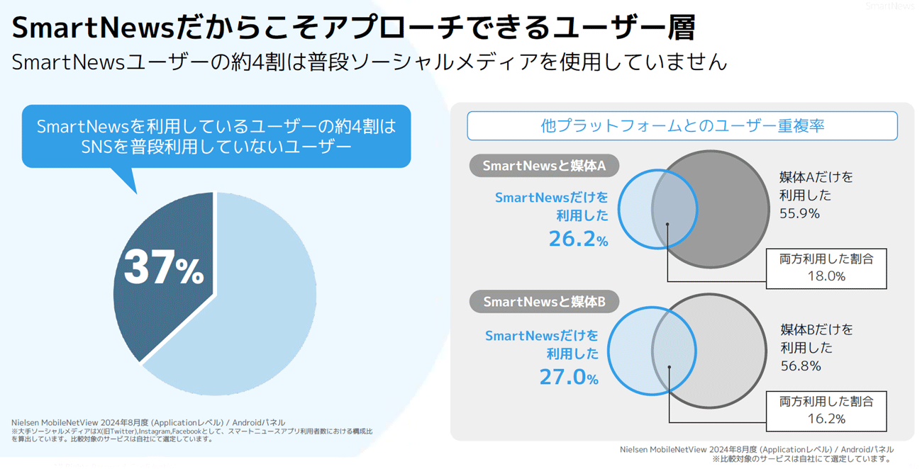 SNSへの投資をどれだけ増やしても、この37%には届かない。SmartNewsを活用することは、単にインプレッションを増やすだけでなく、この「構造的なリーチの穴」を埋めるための、合理的な1つの手段になると思います。