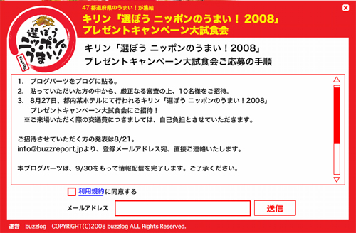 同様のキャンペーンとして現在同社では「選ぼう ニッポンのうまい!大試食会」というキャンペーンを実施しており、先ほどの事例と同様ブログパーツを貼ることで試食会のモニターに応募できる。締め切りは8月20日までとなっているので、よろしければ応募してみてはいかがだろうか。