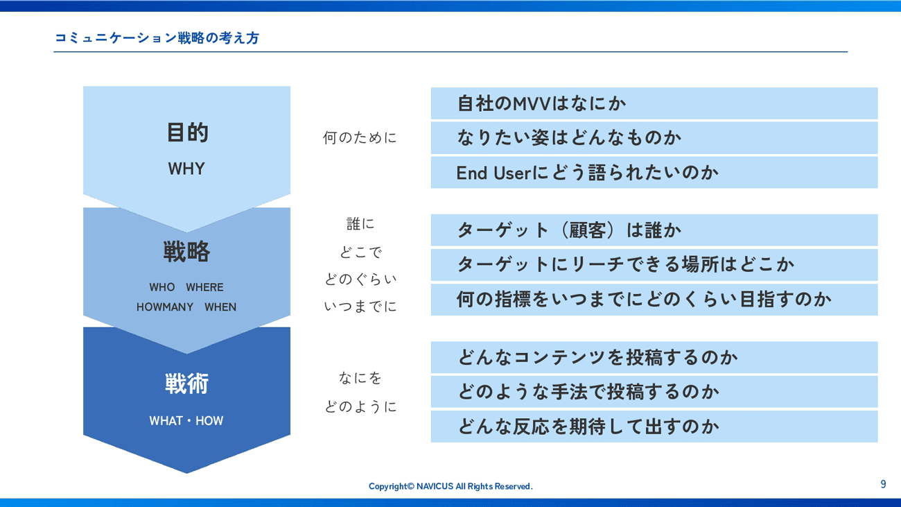 佐久間:まずは「目的」から定めることが大切です。なぜ、何のためにSNSを運用するのかを考えましょう。「手法」や「バズらせるためのハック術」から入ってはいけません。「目的」を軸に据えて、それに寄与するための手法を選び取るのがNAVICUS流の正攻法です。