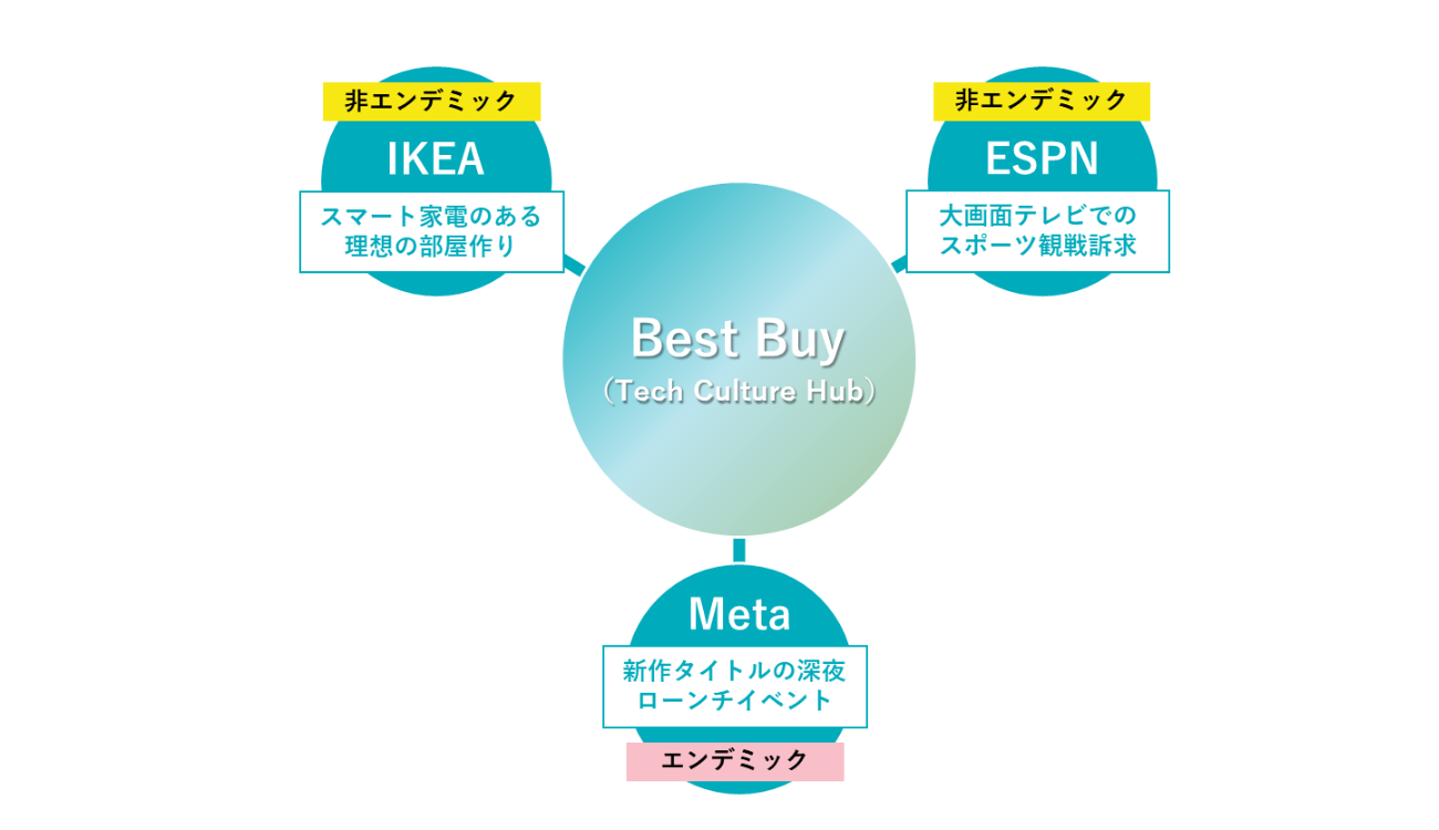 ここで注目すべきは、IKEA(家具)やESPN(スポーツ放送局)といった、家電量販店の「棚」には通常並ばない「非エンデミック」な企業が、Best Buyの店舗をメディアとして購入している点だ。